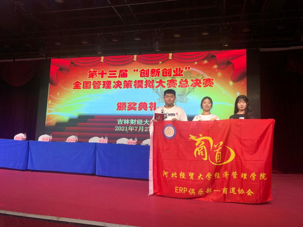 本次大赛由虚拟仿真实验教学创新联盟经济管理类专业工作组指导、全国管理决策模拟大赛组委会主办,至今已连续举办十三届。大赛以“创新创业”为主题,目的是让学生通过高度仿真的企业经营管理环境,深入学习掌握和运用企业经营管理及决策知识,提高实战能力。本届大赛自2020年9月启动,共有500多所高校的2000余支队伍参加了初赛,经过省赛、大区赛、大区复活赛、全国半决赛的层层选拔,最终96支队伍进入全国总决赛,于吉林长春展开总决赛巅峰对决。星空代表队在没有软件的情况下,克服重重困难,艰苦训练了8个月,表现出了坚强的毅力,最终凭优异的成绩进入全国总决赛的现场,与安徽大学、华北电力大学、中国石油大学、深圳大学、内蒙古大学等知名高校同台竞技,获得了一等奖,充分彰显了星空学生高超的学习水平和不凡的竞技实力,为我们经贸大学经管学院争得了荣誉,同时也为星空在省内外争得了很高的荣誉。