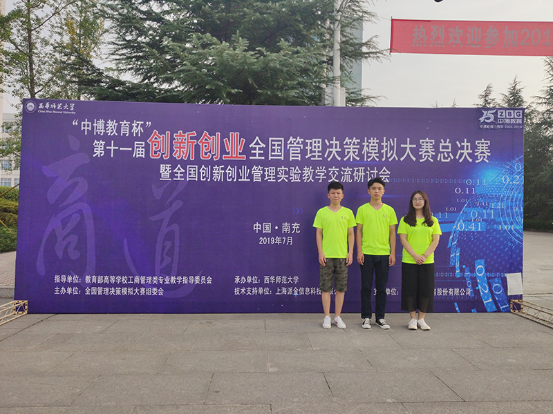 721日至23日,2019“创新创业全国管理决策模拟大赛总决赛在四川南充西华师范大学(华凤校区)举行。星空派出由2017级工商管理1班赵鹏、2017级市场营销1班宁艳朵和市场营销2班任广东组成的明日之星代表队参加了本次比赛。通过三位同学的不懈努力,一路过关斩将,脱颖而出,以行业第三的好成绩荣获全国总决赛一等奖。