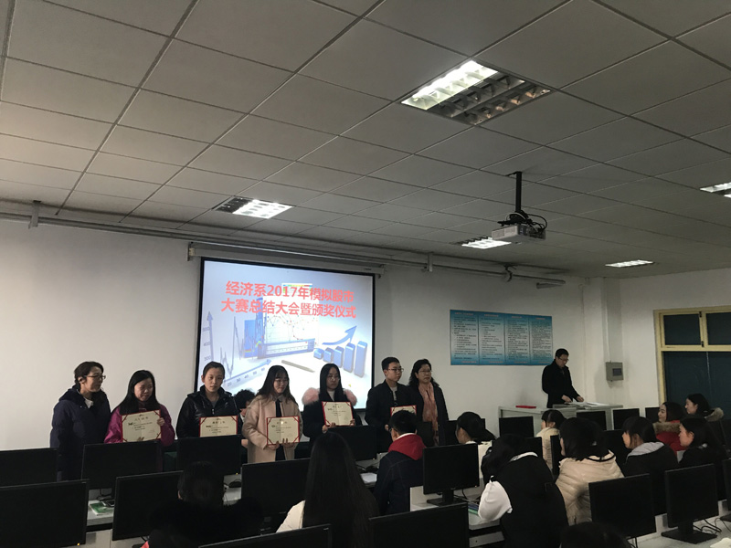 1127日,经济系2017年模拟股市大赛总结大会暨颁奖仪式在南院三教502举办。实践教学部副部长柳冬青、经济系书记郑学栋、主任张玲芝出席总结会并为获奖同学颁奖,100余名学生参加了会议。