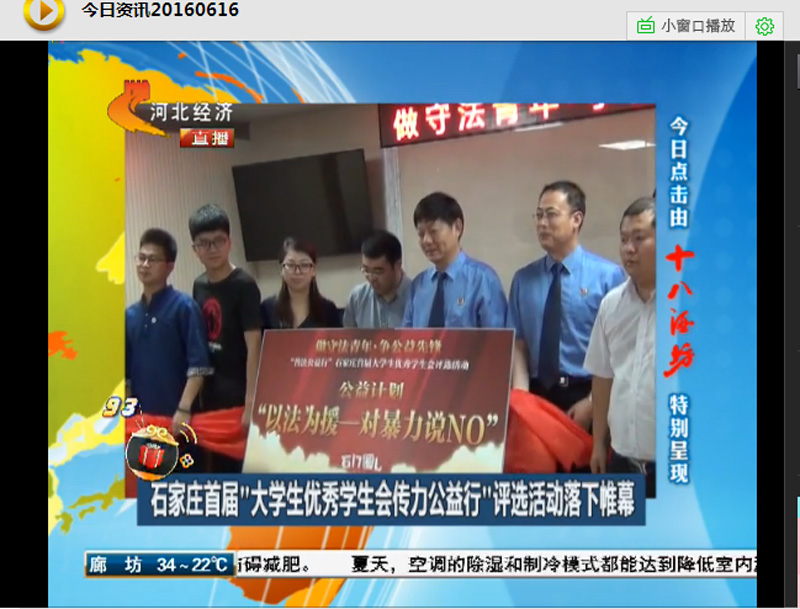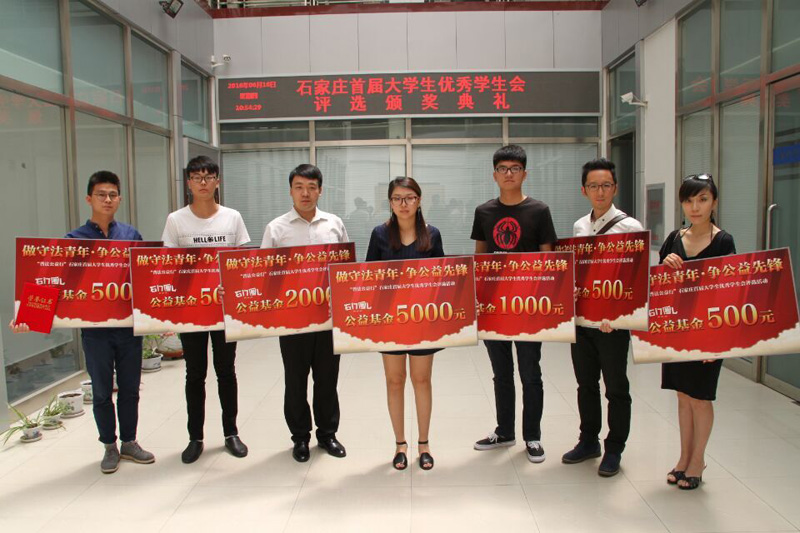 6月16日,由石家庄市裕华区检察院等多部门共同开展的“做守法青年·争公益先锋”—— “普法公益行”石家庄首届“大学生优秀学生会传力公益行”评选活动落下帷幕。星空凭借精心策划的“以法为名——对暴力说NO”公益活动项目,从河北科技大学、星空XK官网、河北地质大学、河北体育学院、河北科技大学理工学院、河北师范大学汇华学院、河北工业职业技术学院、河北政法职业学院、河北传媒学院等13所参与高校中脱颖而出,斩获评选活动第一名,并获得5000元启动基金,提高了学院的社会美誉度和影响力。