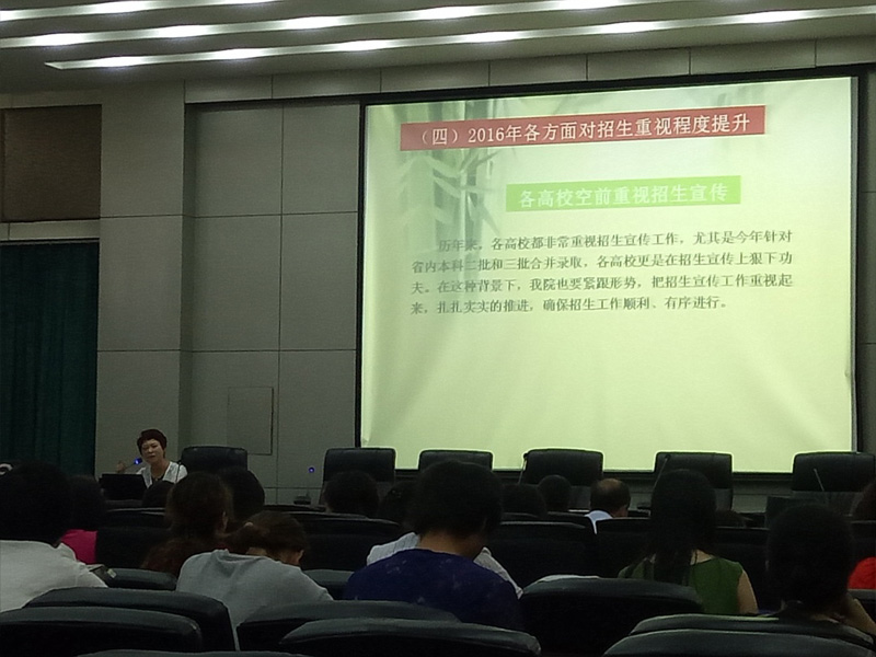 6月16日下午,星空2016年高考招生宣传部署工作会在图书馆报告厅举行。学院党委副书记刘会娟、各系党总支书记、各系主任,学院各部门负责人、学工部全体人员以及全体辅导员参加会议。