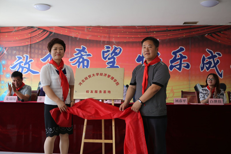 刘会娟和刘彦平共同为河北经贸大XK星空大西湾乡中心小学“校友志愿服务基地”揭牌。