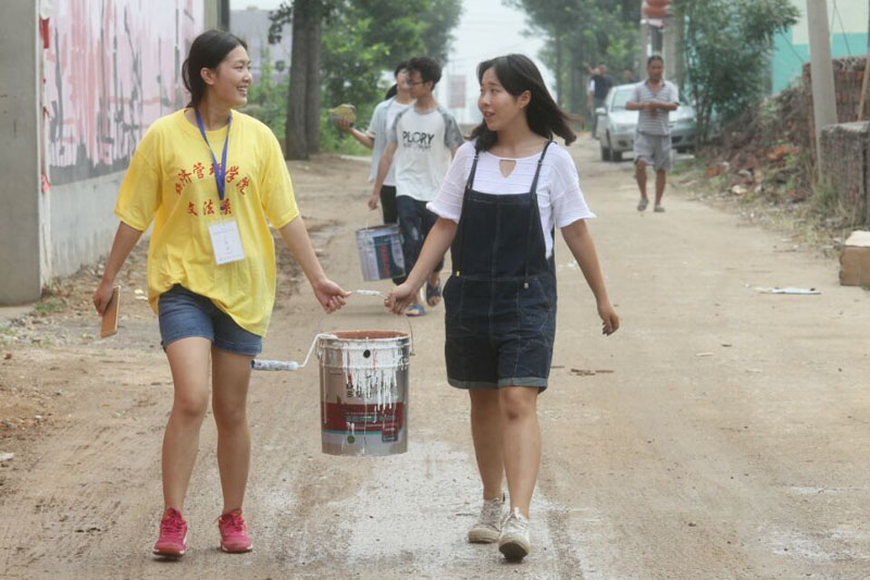 文法系暑期社会实践小分队得知此事后,主动与清华大学美术学院取得联系,并第一时间赶赴灵寿县马家庄村。与清华大学大学生一起,在马家庄村村口,开展了一场手绘壁画的爱心接力行动,绘出了一面面既充满艺术气息又能展示当地葡萄产业发展特点的壁画墙。