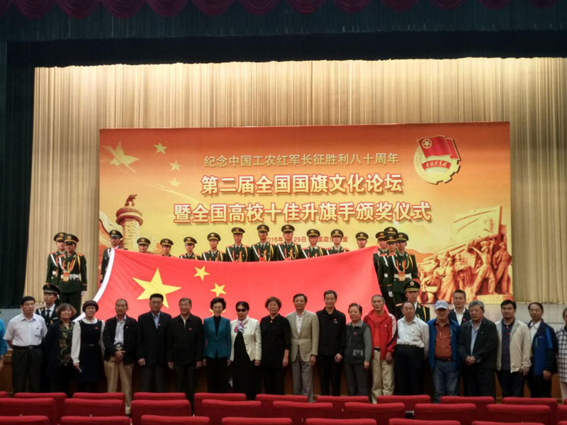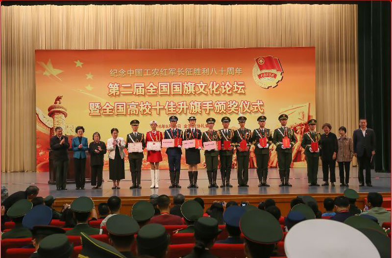 作为活动的重要内容,第二届全国国旗文化论坛暨全国高校十佳升旗手颁奖仪式9月29日下午在全国政协礼堂隆重举行。本次征集活动全国共有67所高校参加,16万多人参加网络投票。经过专家评审,结合网络投票结果,星空国旗护卫队员吴浩然同学荣获“全国高校十佳升旗手”荣誉称号。
