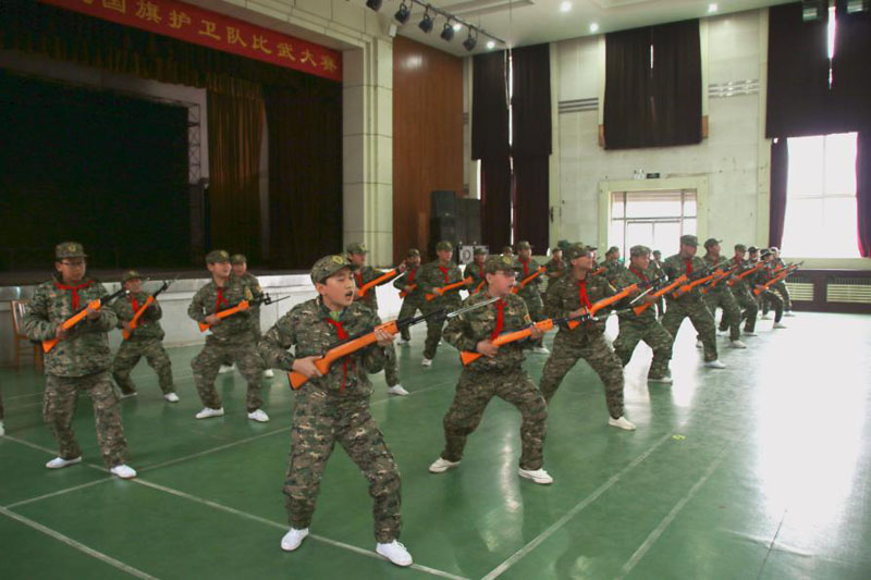 比赛在庄严的出旗奏唱国歌仪式中拉开帷幕,随后,一段精心制作记录片带领大家回顾国旗护卫队不怕困难坚持训练的场景。接下来,参赛队伍响彻礼堂的一声“齐步走”正式拉开了比武大赛序幕。5个班共51名队员首先进行必选动作——队列会操表演,各班以激昂的士气,饱满的精神状态,整齐的步伐,飒爽的英姿征服了观众,现场掌声阵阵。接下来是才艺展示环节,国旗护卫队用一曲铿锵有力的《强军战歌》,表达他们对青春,对祖国的热爱;护卫队志愿服务基地——石家庄庄园小学国旗班的小朋友向大家汇报了训练成果,他们表演的《刺杀操》,动作连贯,干净利落,令在场的观众刮目相看。最终,护卫队一班和霍英龙分别获得团体、个人一等奖。