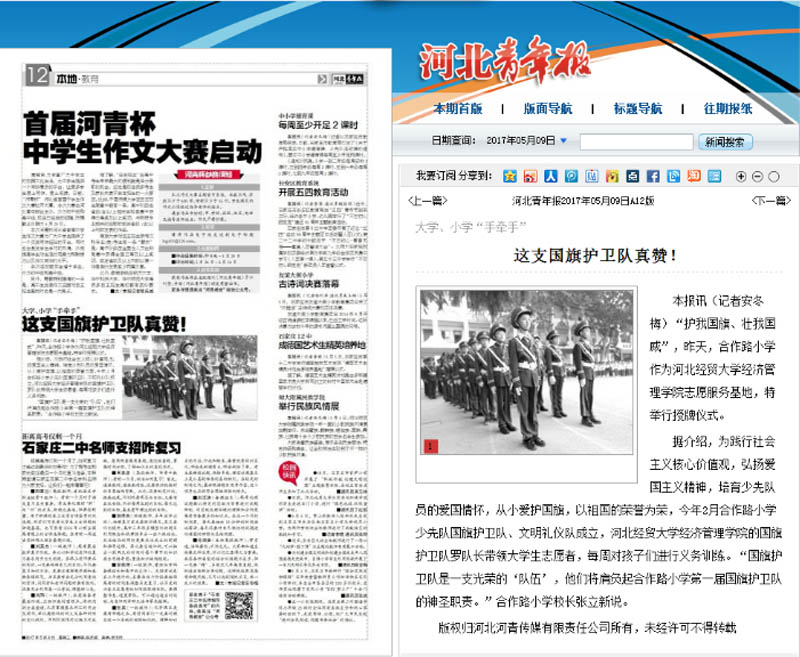 5月17日,河北广播电视台少儿科教频道《校园新鲜爆》栏目以《XK星空志愿服务合作路小学基地挂牌成立》为题,对星空在合作路小学建立“党员、团员、少先队员”国旗护卫队志愿服务基地进行专题报道。5月9日,河北青年报以《这支国旗护卫队真赞》为题对该活动进行报道。