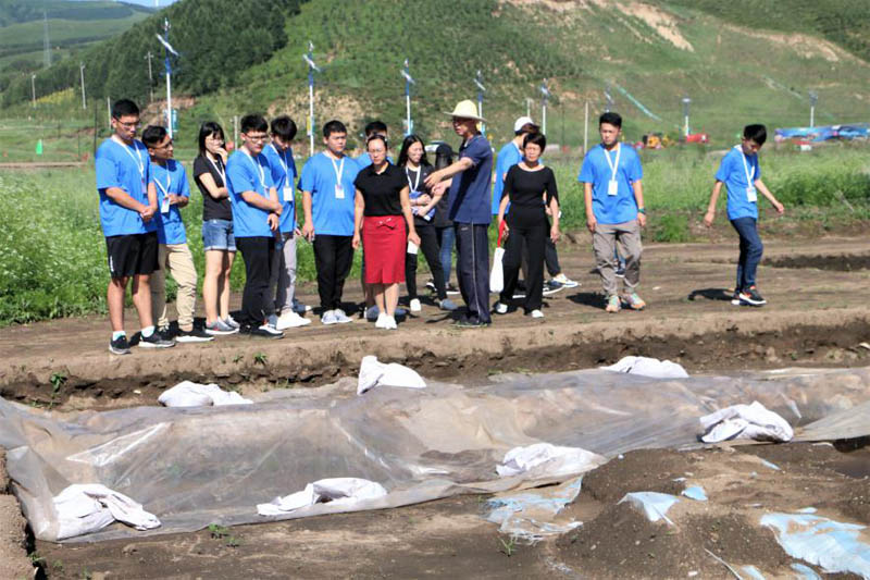 参观完规划展馆后,小分队来到位于太子城村村南的金代太子城遗址。据张家口文物研究所渠所长介绍,太子城遗址时代确认为金代中后期金世宗、金章宗时期,有可能是历史中记载金章宗驻夏的泰和宫。遗址整体为长方形,面积约4万平方米。渠所长带领大家参观了遗址发掘现场,介绍了考古的基本方法,指导学生们辨认哪里是城门、哪里是大殿。学生们表示第一次走进考古现场,学习考古知识感到非常新鲜。