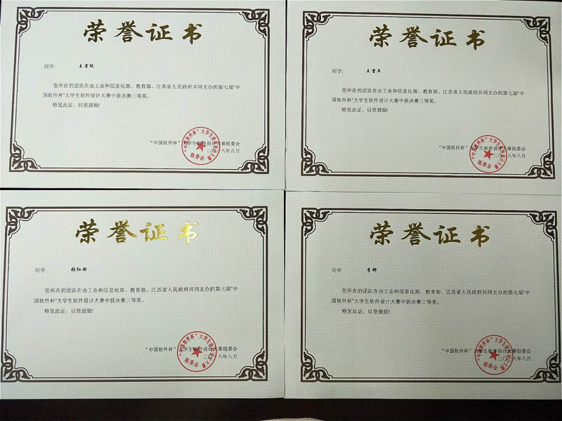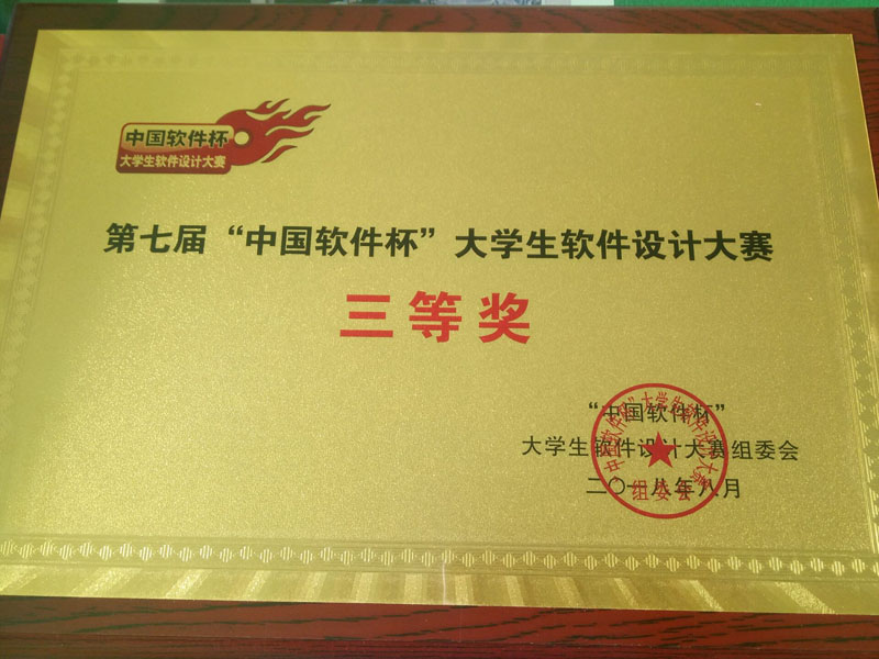 近日,第七届“中国软件杯”大学生软件设计大赛总决赛在南京国际博览中心举行。星空由信息系王雪纯、王雪年、张红羽组成的经管一队和黄文硕、刘兵、李娜组成的经管二队分别荣获团体三等奖,为学院争得了荣誉。