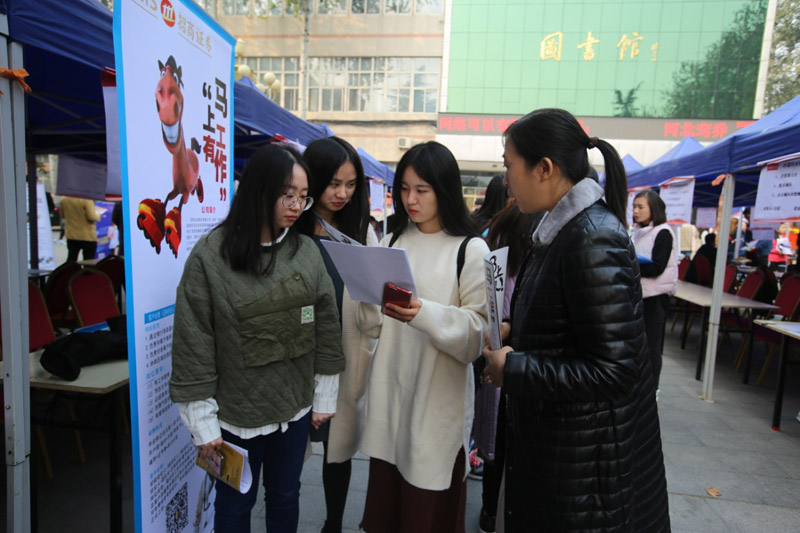11月2日,星空2019届毕业生首场校园双选会在学院图书馆广场举行。双选会邀请到石家庄英孚培训学校、孩子王儿童用品有限公司、河北源达证券股份有限公司、中国太平人寿、新天际教育集团、千喜鹤股份有限公司等300多家知名企业,提供就业岗位4200余个。