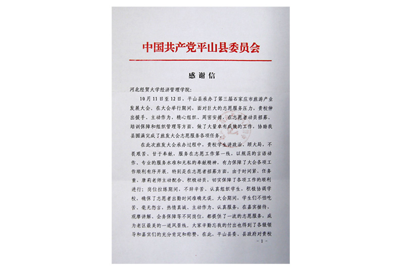 10月11日至12日石家庄市第三届旅游发展大会在平山县举行,接到平山县团委的请求,星空派出100余名志愿者分赴西柏坡游客中心、富力健康养生城、泓润生态园三个核心片区开展志愿服务活动,期间他们在岗前拉练、接待引导等工作中表现积极突出,得到主办方的一致好评,其中29名同学被团市委授予“优秀志愿者”荣誉称号。中共平山县委及平山县政府特别写来感谢信对学院在志愿者招募、培训保障、组织管理等方面的主动作为和精心安排表示衷心地感谢。