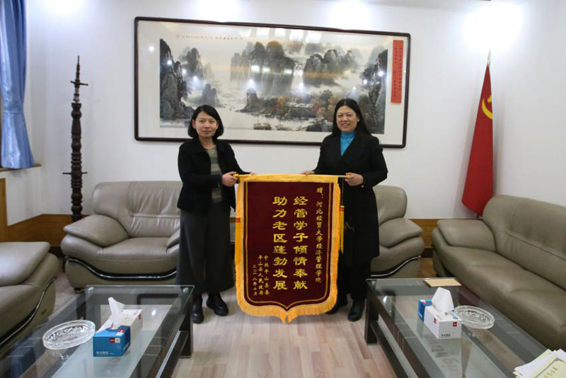 11月13日下午,平山县团委副书记王秋静代表平山县团委将一面“经管学子倾情奉献助力老区蓬勃发展”的锦旗送到学院党委副书记张丽英手中,对10月中旬星空志愿者在石家庄市第三届旅游发展大会中给予的支持和帮助表示感谢,同时将平山县委县政府的一封感谢信送到院党委书记张进良手中。