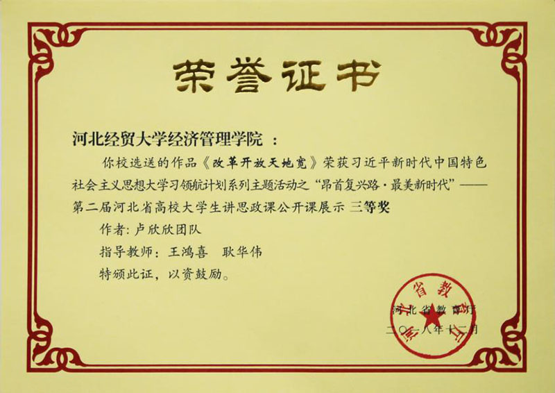 今年6月,按照河北省教育厅的文件要求,星空宣传部和各系积极筹备,精心选拔学生团队,推荐优秀作品参加比赛。由学生卢欣欣、王宏旭、王天艺、骆程组队制作的《改革开放天地宽》思政课,同省内30多所高校选送的作品竞争,最终获得三等奖,王鸿喜、耿华伟获得指导老师奖。