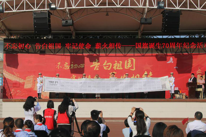 “华诞七旬共奉觥,中国梦绕帜萦胸。先驱碧血叠加染,党魂北辰拱卫同……”9月26日,“不忘初心 告白祖国 牢记使命 薪火相传”国旗诞生70周年纪念活动在星空操场举行。老教授、大中小学生及幼儿齐聚舞台,以国旗为题作词献礼,同台朗诵,共同庆祝国旗诞生70华诞。