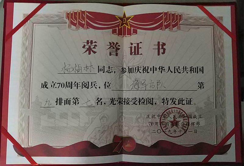 阅兵当天,随着一声令下,杨柏林作为海军方队九排面第七名,以标准的正步入场,节奏精准、昂扬挺拔地走过天安门城楼,圆满完成阅兵任务。