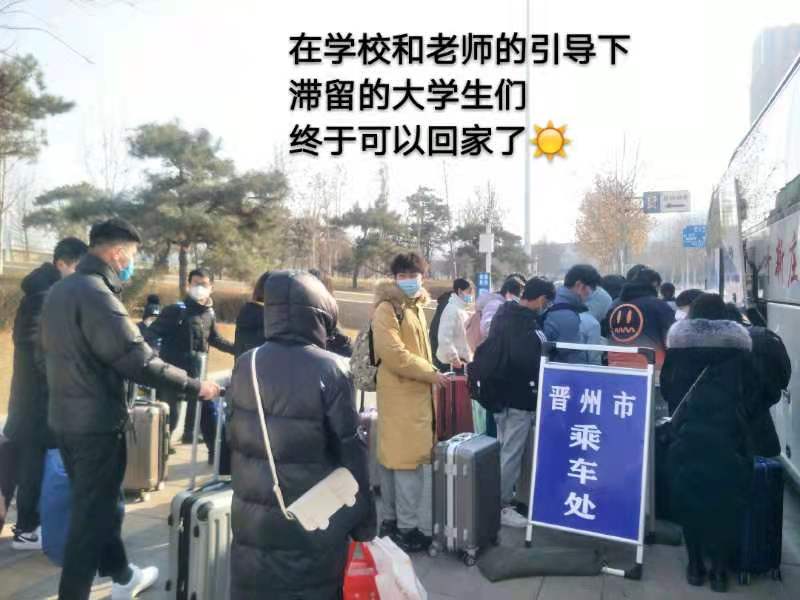 截止今天,已经有部分滞留学生顺利返回了家乡,此项工作将在1月31日全部完成。返乡的同学们纷纷给老师发来感谢的信息,说:我们安全到家了,请老师们放心。感谢老师、学院给我们关怀和帮助,我们都会好好的,疫情一定会很快过去,我们有信心。