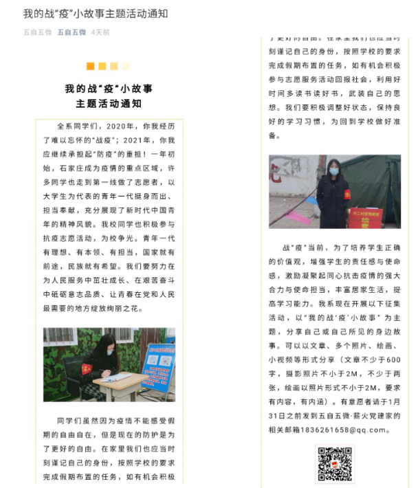 同时,会计系以“弘扬抗疫精神,强化使命担当”为主线,开展了系列育人活动。1月22日-31日,会计系利用“五自五微”薪火党建家公众号平台开展了“我的战‘疫’小故事事迹征集活动。师生党员和入党积极分子共53人积极参与,共收集了75份不同形式的“身边抗疫故事”,凝聚起抗击疫情的强大合力和使命担当;会计系团总支开展“假期居家少聚集,重新定义‘断舍离’”主题活动,各团支部认真筹备,通过分享居家学习读书心得、运动打卡、居家劳动等形式落实好疫情防控工作,强化青年学生的责任使命;同时,会计系还组织292名同学利用软件进行线上实习实训,扎实推进实践教育,助力人才培养。