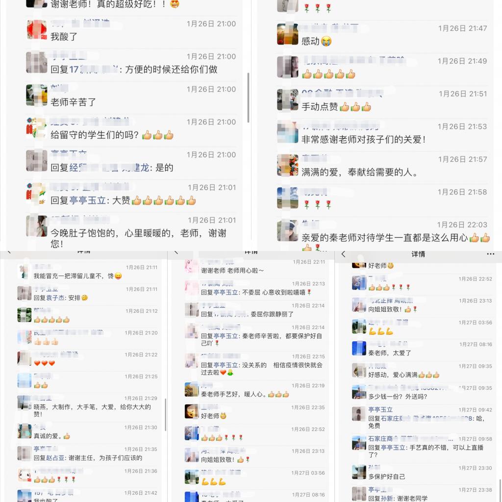 由于疫情,不少学生滞留在石家庄,秦晓燕老师所带的17文法系新闻班和广电班一共有11名同学没走成。得知这些情况后,秦老师第一时间通过微信视频、打电话等方式询问学生们有什么困难、生活用品是否齐全等等。在得知小区封闭管理做饭不方便时,秦老师第一时间申请了市区通行证,动员家里人齐上阵,买肉、炖肉、烙馍、打包,为学生做了一顿肉夹馍,下午5点开车一个一个去送,11名学生分住在7个小区,等到送完最后一位同学,已经晚上6点半了,老师的肉夹馍让在异地的学生感受到了家的温暖。为让学生少吃点方便面,秦老师想办法给他们改善伙食,为了让学生们中午能吃到饺子,老师早上7点就起来准备,中午12点多,每位滞留石家庄的学生都吃到了热腾腾的饺子。