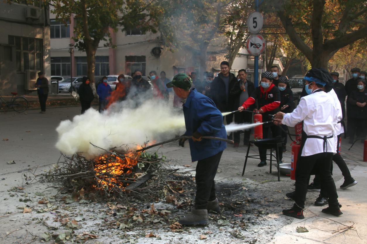 演练开始前,路士国围绕消防安全管理“四个能力”对参训人员进行了理论培训,针对食堂火源种类、灭火方式的选择进行重点讲解,并强调了食堂用火安全以及扑救初级火灾方法。安全工作部人员现场演示了灭火器等消防器材的使用方法和操作要领。