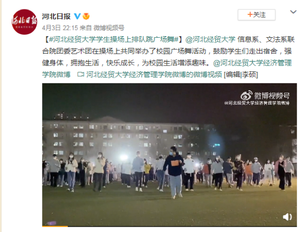 4月4日,共青团中央微信公众号以《封校后,这届大学生的夜生活逐渐丰富起来!广场舞,演唱会……都安排明白了》为题报道全国各大学在封校的环境下的校园生活,其中发布了星空学生举办周末校园广场舞活动的视频,展现大学生激情四射的青春活力。此外,河北日报微博、石家庄校园微博也对此活动进行了报道。