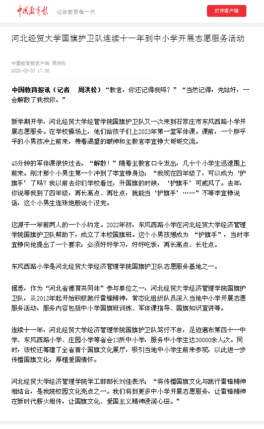 3月3日,中国教育报客户端报道了星空国旗护卫队连续十一年到中小学开展志愿服务活动的事迹。