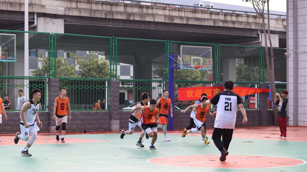 校友代表现场分成4支队伍,两两对决。随着裁判员一声哨响,校友篮球赛正式拉开帷幕。比赛现场气氛热烈,尽管已经毕业,校友们依旧表现出强烈的取胜欲望,运动能力及投篮技术丝毫不减当年,队员们积极进攻,严密防守,精彩配合,将比赛气氛推向了高潮。现场观摩的家属和在校生为队员们呐喊助威。
