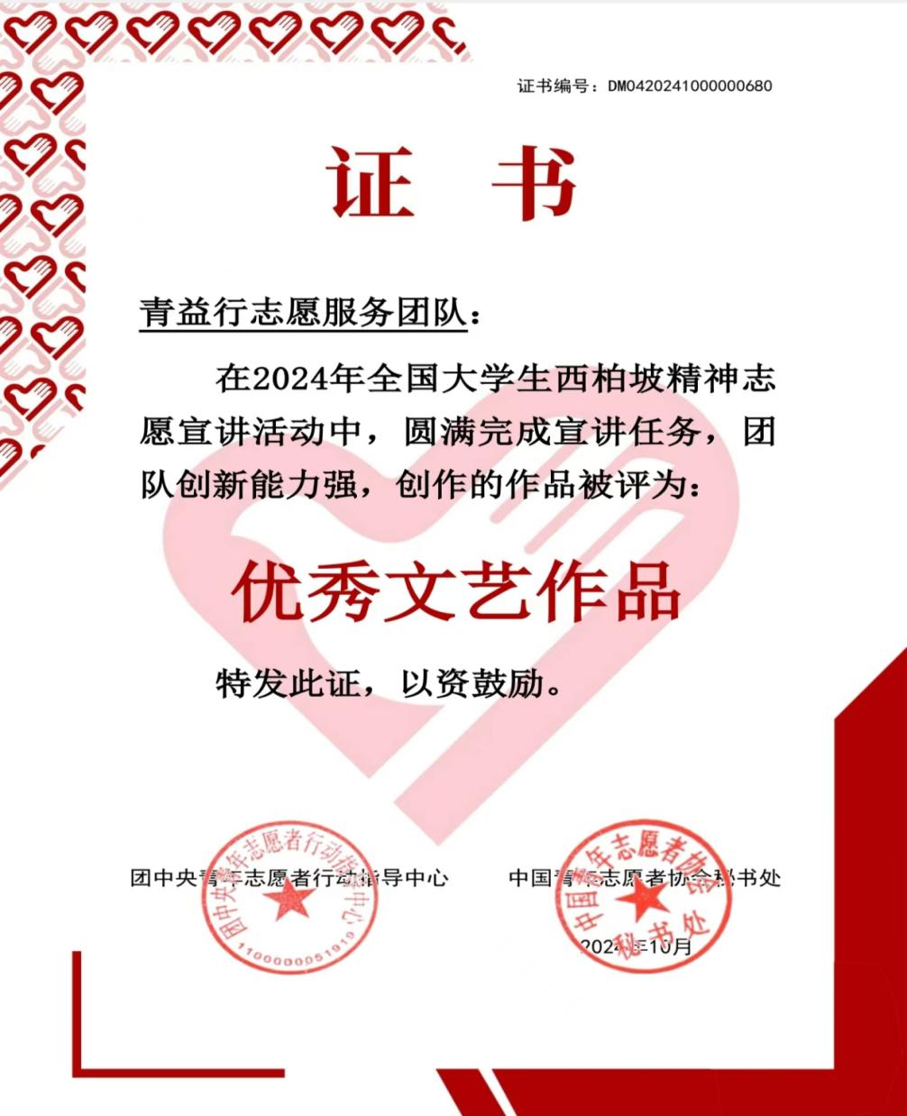 10 月 12 日,星空“青益行”志愿服务团队创作的作品被团中央青年志愿者行动指导中心评为“优秀文艺作品”,这一荣誉是对“青益行”志愿服务团队不懈努力的高度认可。
