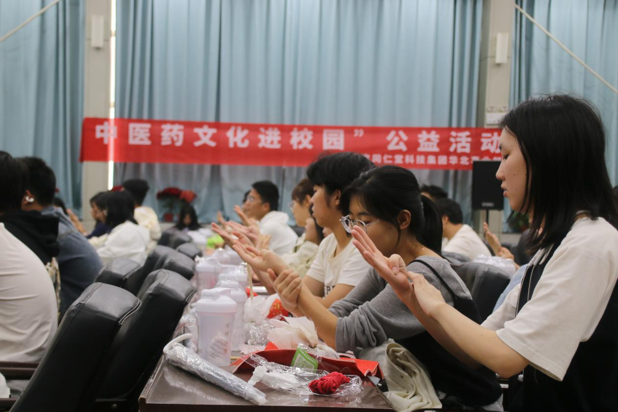 讲座中,北京同仁堂资深讲师张建桥以《中医药文化》为题介绍中医药基础理论,讲解常见病的中医药防治,她巧妙地从“中药”一词的诠释切入,逐步揭开中医药理论的神秘面纱。她向同学们介绍了中医经典的“望闻问切”四诊法,深入浅出地讲解了“把脉”技艺,并将中医药理论与日常生活中常见疾病的防治相结合,让同学们深刻体会到中医药文化的重要性和实用性,激发他们对中医药文化浓厚的学习兴趣。讲座过程中,张老师巧妙地穿插问答环节,与同学们积极互动,现场气氛热烈,同学们争相回答,不仅加深了对中医药知识的理解,更收获了宝贵的学习体验。讲座接近尾声时,张老师亲自指导同学们动手制作艾草锤,这一实践环节让每一位参与者都能亲身体验中医药文化的独特魅力,感受传统医学的匠心独运。