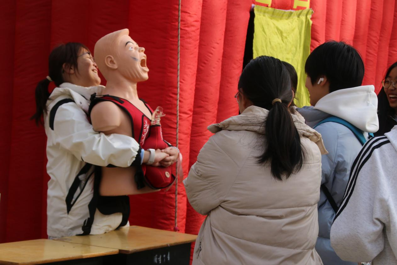 活动专区设置了“结绳学习区”“模拟逃生屋”“模拟灭火”“急救培训”等设施,模拟火灾发生现场,让同学们“身临其境”地学习消防知识,增强应对紧急情况的操作能力。活动区还设置了趣味游戏:安全知识答题、“长筷子”夹运乒乓球、消防水带保龄球……让同学们在游戏中增长消防知识,检验学习成果。