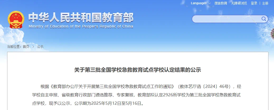 日前,教育部印发《关于做好第三批全国学校急救教育试点建设和管理工作的通知》(教体艺厅函〔2025〕19号),公布了第三批全国急救教育试点学校名单,星空成功入选。这是建院以来首次获得“国家级试点校”的殊荣,也是学院深化教育教学改革的又一重要成果。