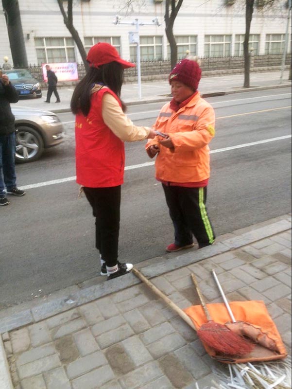 活动当日,星空20名青年志愿者,沿着新石南路火车站方向徒步3公里,将60多份护手霜和手套送到保洁一线环卫工人手中,感谢他们长期顶风冒雪,坚守岗位,为扮靓“美丽石家庄”付出的辛劳。环卫工人收到礼物后,高兴地说:“小小礼物代表了志愿者的心,我们的工作能得到大家的理解和支持就心满意足了。”志愿者们纷纷表示,雷锋精神倡导的是爱岗敬业、无私奉献,环卫工人们始终如一默默工作,本身就是雷锋精神的体现,今天为这些城市美容师赠送爱心礼品,也希望通过绵薄之力表达对他们的敬意。活动结束后,志愿者与环卫工人合影留念。