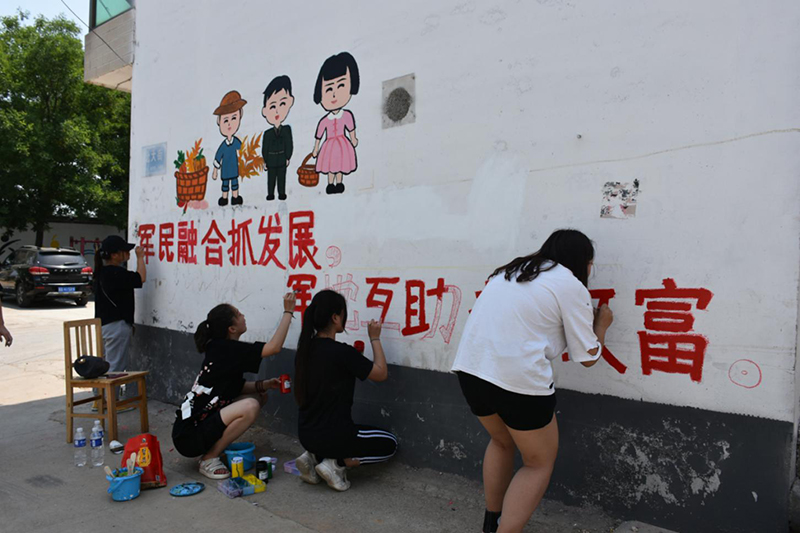 管理系党支部的志愿者们共分为四个小组,为该村主干路、文化活动中心等地的墙面上增加绘画和标语。墙绘以国家脱贫政策和美丽乡村的建设为主题,包括传统文化、健康运动和脱贫攻坚等图画内容,配有“坚定不移跟党走,同心共筑中国梦”、“扶到点上,扶到根上,扶贫扶到家”等标语。经过为期两次的绘画之后,川房村的村容村貌得到了极大改善,同时川房村的村民对扶贫政策也有了更深入的了解,在思想上更加坚定了脱贫致富奔小康的信心。