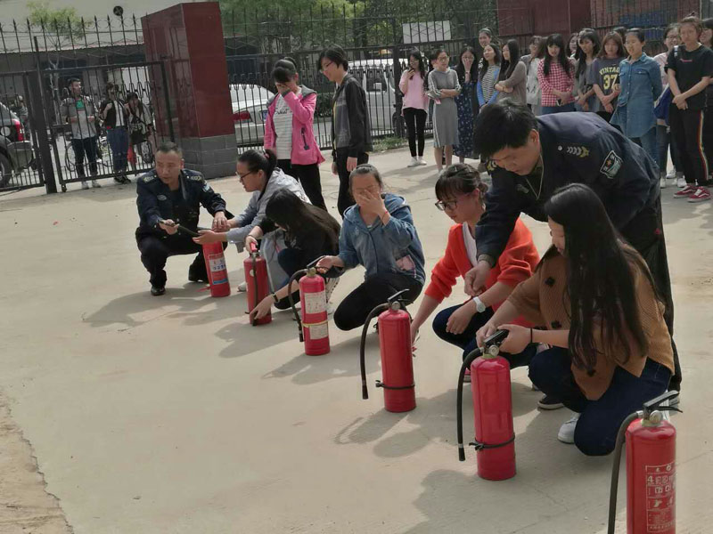 随后,工作人员将大家集中到操场南侧,演示消防设备的正确使用方法,并组织大家进行实际操作。