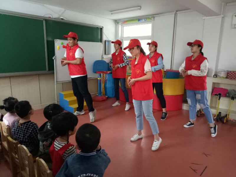 石家庄七彩阳光幼儿园大部分是有听力障碍的孩子,活动前期,志愿者们通过微信、微博等平台进行宣传,并认真安排核对活动流程。该活动将参与的三个班级分为三种活动主题模式,在以“动物总动员”为主题的豆豆班,志愿者们带着孩子们一起搭积木,合唱《幸福拍手歌》;以“智慧自然”为主题的甜甜班,志愿者们和孩子们一起拼七巧板,一起捏橡皮泥;在以“童话小天地”为主题的朵朵班,志愿者们手把手教孩子们折纸鹤、叠宝塔,还给孩子们表演了生动形象的手偶剧。志愿者用爱心和行动拉近了与孩子们的距离,为孩子们送去了快乐。