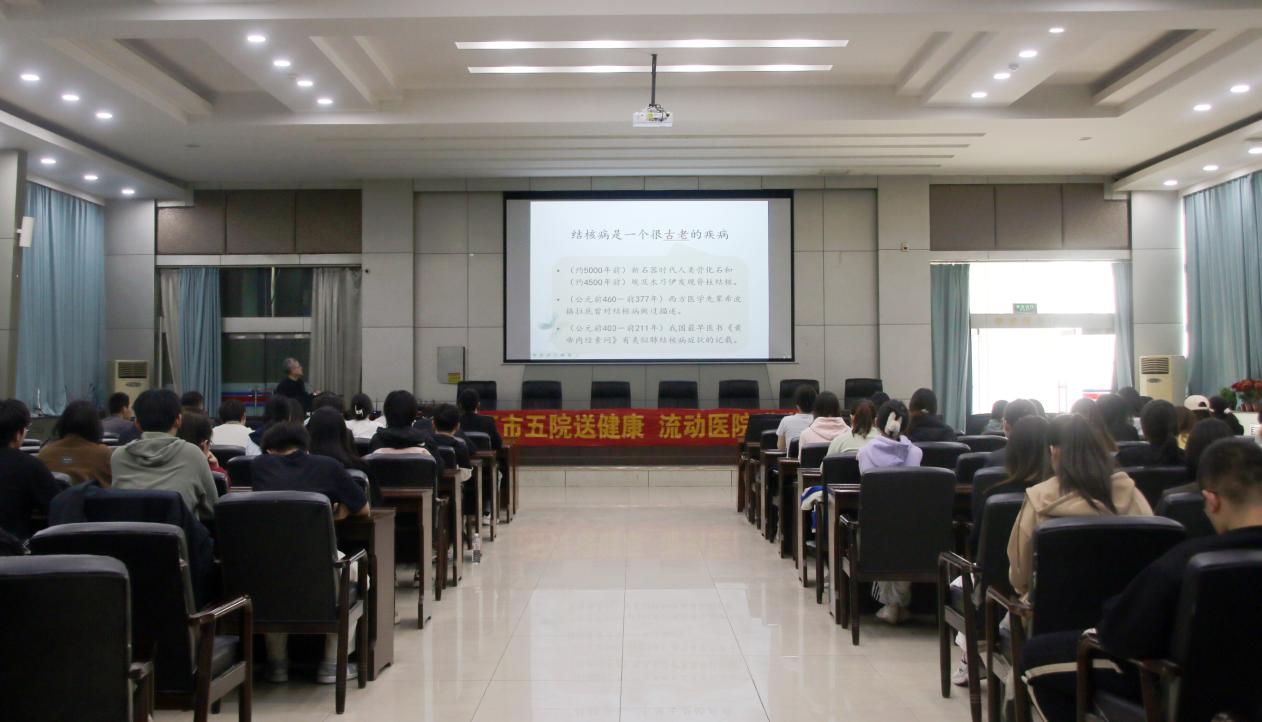 王海宾通过图片数据和生动的资料案例,直观地向同学们详细介绍了什么是肺结核、结核病的易感人群、感染症状、传播途径、预防方法以及治疗方法。考虑到春季是传染病高发季节,王主任还贴心地向同学们科普了甲流、水痘、麻疹等普通传染病知识,丰富了同学们对传染病的认知。