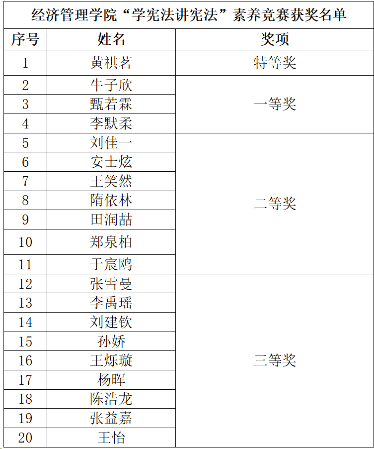 “学宪法讲宪法”演讲比赛吸引了47名同学参加,同学们围绕习近平法治思想的重要意义、丰富内涵、核心要义、精神实质、实践要求和宪法关于公民基本权利义务、发展教育事业等方面的规定,以第一视角展开,结合社会热点讲述身边的故事。经评委认真评判,孙佳悦同学获特等奖,董晓硕等3名同学获一等奖,张佳琪等6名同学获二等奖,高弘骏等9名同学获三等奖。“学宪法讲宪法”素养竞赛为线下闭卷考试,以宪法法律知识为核心,结合国情教育、爱国主义教育及行为养成教育,检验选手对宪法条文的理解与应用能力,全面考察选手对《中华人民共和国宪法》及相关法律知识的掌握程度。经专业教师认真评判,黄祺茗同学获特等奖,牛子欣等3名同学获一等奖,安士炫等7名同学获二等奖,张雪曼等9名同学获三等奖。