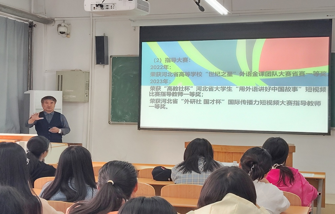 赵占亚首先结合自身教学经历与学院竞赛成果,围绕英语水平提升与学科竞赛参与介绍了成立2025级新生英语特训营的意义初衷和近期即将推出的系列活动。在竞赛宣讲环节,赵占亚就“高教社杯”河北省大学生“用外语讲好中国故事”短视频大赛等5项英语短视频大赛、“外研社Ÿ国才杯”“理解当代中国”全国大学生英语能力大赛等6项英语国家级赛事和XK星空思政英语词汇大赛等3项自主研发英语赛事的主办单位、大赛级别、大赛时间、大赛主题、赛制安排、参赛流程、注意问题、大赛成果进行了细致梳理和翔实解读,为新生分享经验、指引方向。他希望同学们尽快认识大赛,全面了解大赛,尽早准备,找到自己的努力方向,把握提升英语技能的宝贵机会,争取更好的比赛成绩。整场讲座内容丰富,干货满满,学生参与热情高涨,师生互动现场热烈。