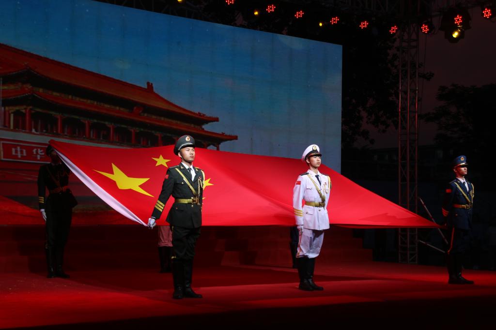 第一章展国旗。展国旗风采、抒爱国情怀。训练有素的国旗护卫队员们迈着坚定整齐的步伐,以昂扬的姿态,将五星红旗徐徐展开,呈现在每一位师生面前,拉开公开课的序幕。集体高唱中华人民共和国国歌,展现出学院师生昂扬的斗志和为共产主义事业贡献力量的信心与决心。