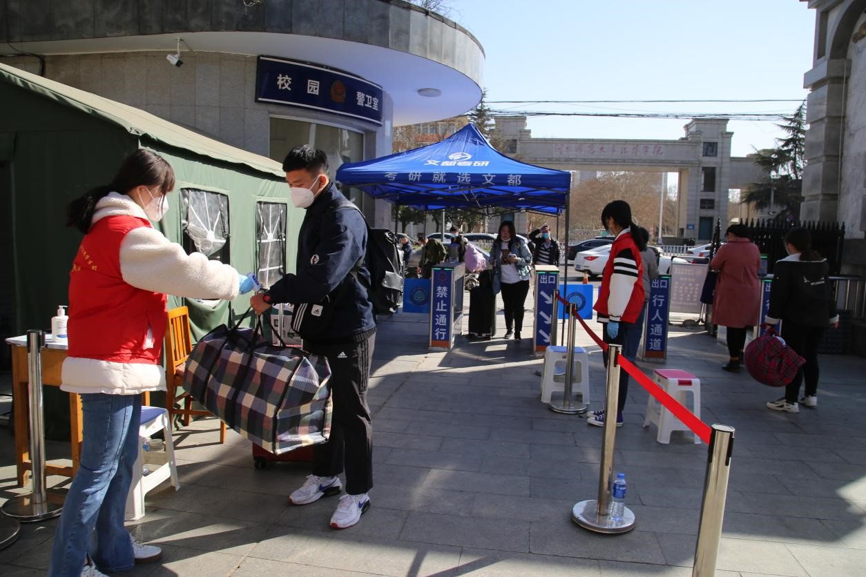 5日一大早,学院领导,各系及相关部门负责人就来到校园,实地查看学生返校情况,迎接返校学生。上午9点钟学生们陆续返校,在刷脸进门,接受志愿者查验核酸检测阴性报告、健康码及行程码,测量体温,进行核酸检测,完成一系列的流程后,学生才能进入宿舍。