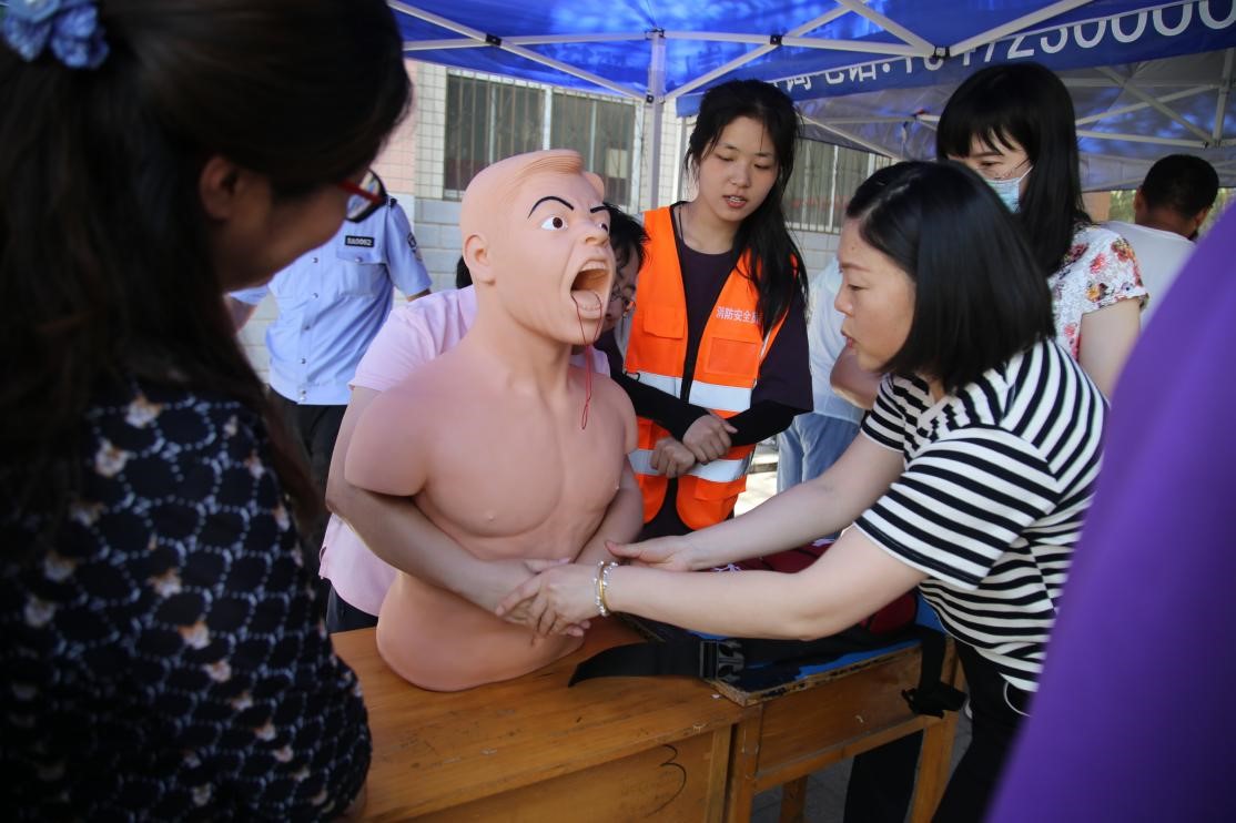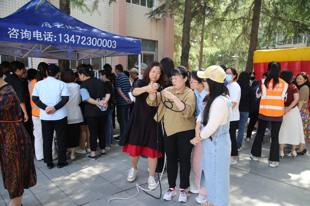 逃生演练开始前,志愿者在各层楼道中布置了烟雾装置,模仿火灾现场的状态,增加受训教职工的实景体验。随着模拟火灾信号的发出,老师们弯腰低头有序地逃出“火灾现场”;模拟火灾逃生帐篷,里面漆黑一片,老师们必须准确识别荧光导视标识,低姿快速通过,才能成功逃离“火灾现场”;灭火实训教学,采用电子火焰装置,需要采取“提、拔、握、压”正确的灭火器使用方法,才能将电子火苗扑灭。在志愿者的指导下,老师们手提喷气式灭火器体验了灭火器的使用步骤和操作技巧;醉酒行走体验,通过佩戴3种不同颜色的模拟眼镜,体验不同程度的醉酒状态,了解酒后对身体平衡、视觉观察、意识判断等情况的影响,让大家认识到酒后驾车的严重性、危害性;结绳训练现场,老师们互帮互助边学边看,掌握了4种基础、常用的结绳逃生自救法;海姆立克训练现场设置一个呼吸道被异物阻塞模拟人,老师们依据培训的腹部冲击法要点,从后背抱住模拟人迅速用力,将堵塞在气道的异物排出。