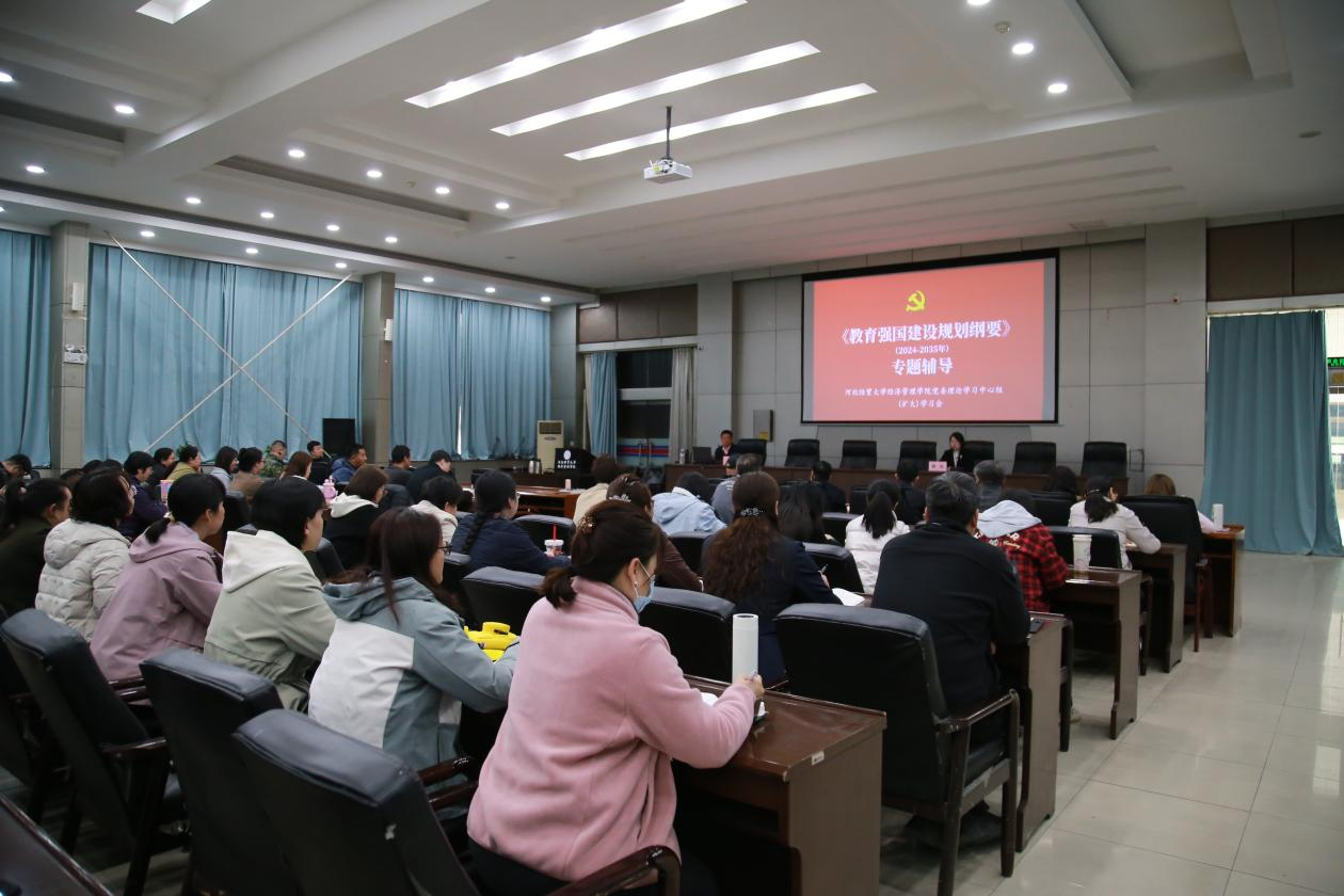 为深入贯彻落实学校第四次党代会精神,深刻把握学院发展所面临的机遇和挑战,3月27日下午,学院党委理论学习中心组在图书馆报告厅召开扩大学习会,专题学习《教育强国建设规划纲要(2024—2035年)》。会议邀请河北师范大学教师教育学院田宝军教授作专题辅导。学院党委理论学习中心组成员、中层管理干部和全体教师党员参加会议,会议由院党委书记蔡杨主持。
